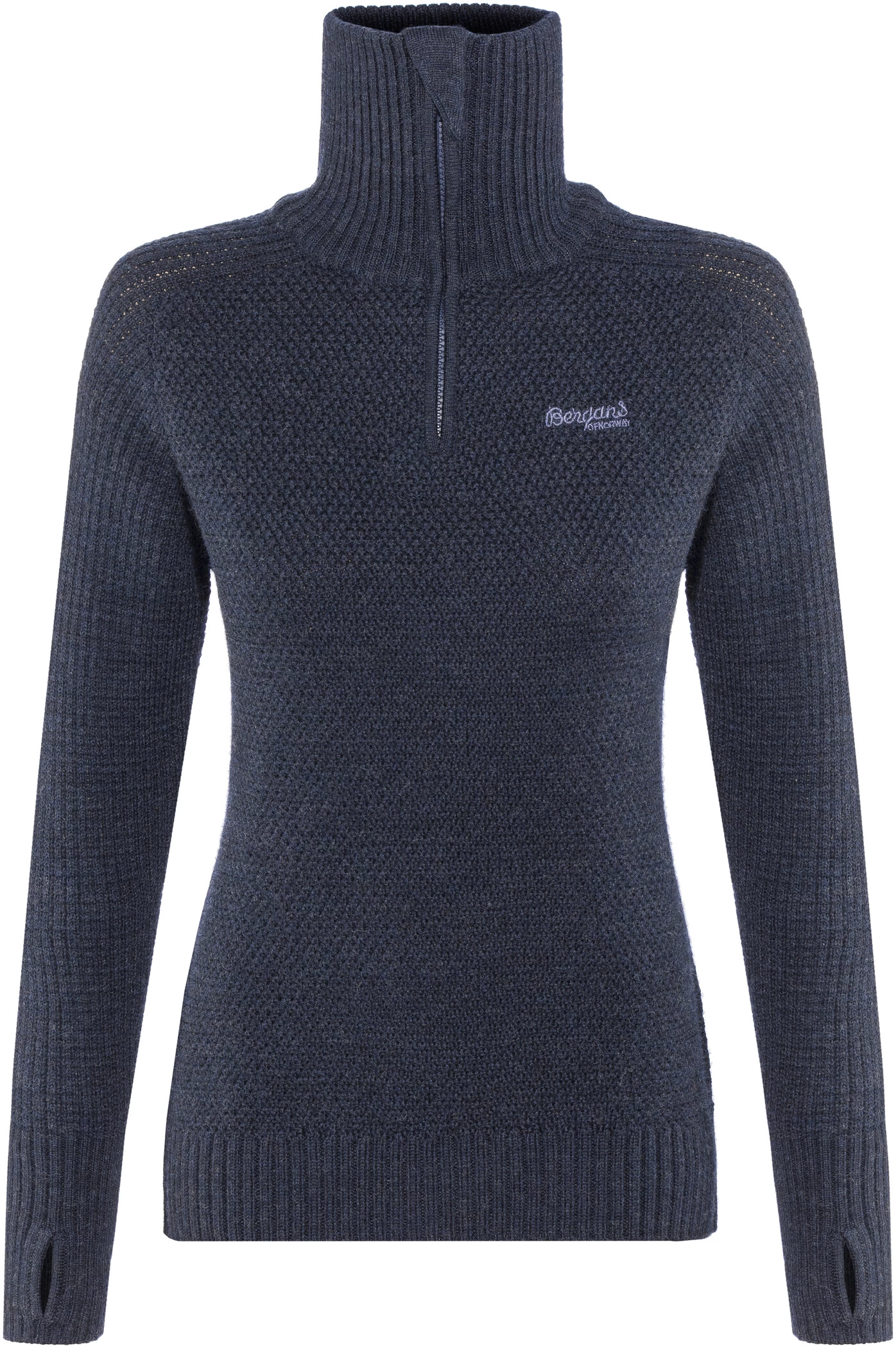 Dikke trui van zachte, comfortabele merinowol met extra hoge kraag en zachte kinbescherming. Kan solo gedragen worden of als verwarmende tussenlaag onder de hardshell jacket.